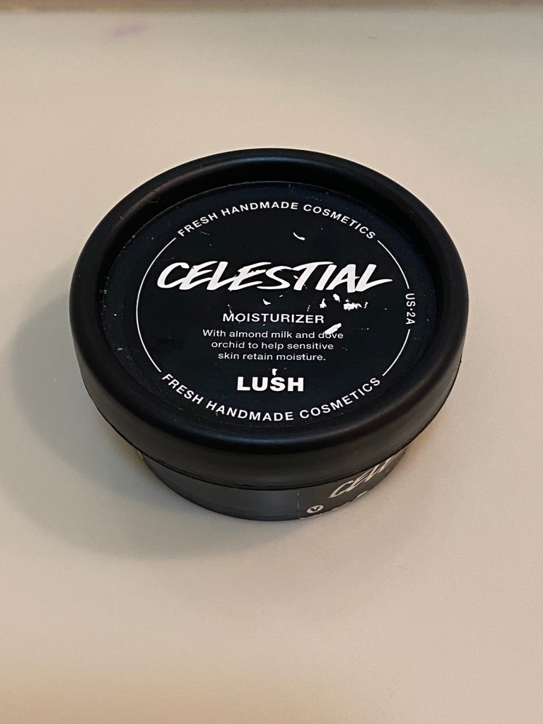 I then use the smallest amount of Lush’s Celestial Face Moisturizer. The smallest amount goes a long way. It’s light, but very moisturizing. It’s perfect for sensitive skin like mine.