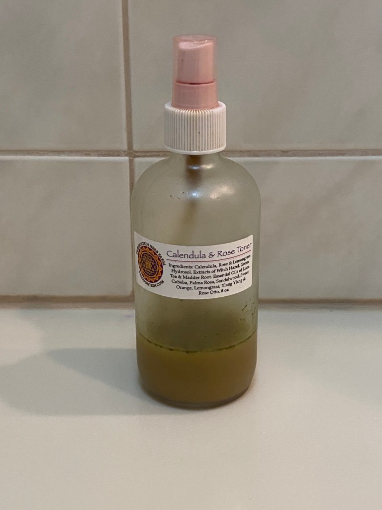 Once I rinse the product off my face and pat my face dry with a towel, I use Tweefontein Herb Farm’s Calendula and Rose Toner. I spray it on my face and neck and let it settle into my skin. It smells really nice, but make sure to shake it well before using.