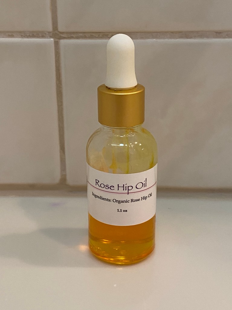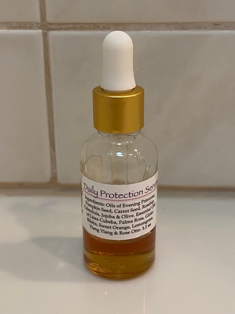 Once the toner dries on my skin, I take four drops of Tweefontein Herb Farm’s Daily Protection Serum and four drops of Tweefontein Herb Farm’s Rose Hip Oil, rub them together on the palms of my hands, and then apply them to my skin. I’ve noticed that using Rose Hip Oil has helped heal any acne scarring that I had on my face.
